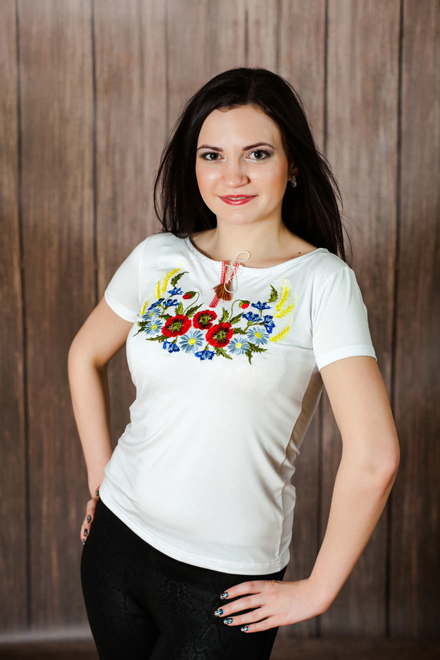 Ця неповторна вишита жіноча вишита футболка "Вінок з колосками" неодмінно стане улюбленою річчю в етномотиві кожної української жінки. Дизайнери вирішили вибрати для цієї вишиванки ексклюзивні українські орнаменти. Квіткові композиції, що складаються з ніжних польових квітів, стали прикрасою цієї моделі. Тендітні кутасики точно не залишать Вас байдужими, адже в них ховається чарівний шарм цієї вишитої футболки. Орнаменти нанесені машинною вишивкою.